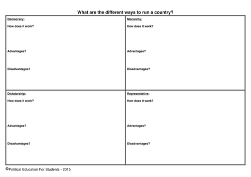 This article lists forms of government and political systems, according to a series of different ways of categorizing them. This worksheet is easily accessible and can be incorporated into any of use this worksheet for your own personal use completely free. Some examples of different types of governments are: In this types of government worksheet, students write the advantages and disadvantages and countries that follow these governments. There are 7 types of government: